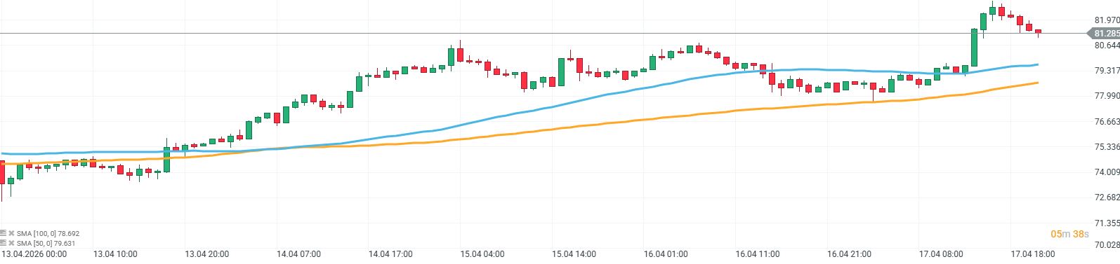 Stříbro během týdne potvrdilo vyšší dynamiku než zlato. Po úvodním růstu z oblasti kolem 73–74 USD / Oz se cena postupně dostala nad 79 USD / Oz, přičemž po cestě několikrát krátkodobě korigovala. Ve druhé polovině týdne se trh držel nad klouzavými průměry a v závěru přišel velmi silný růstový impulz, který cenu vytlačil až do oblasti kolem 81,97 USD / Oz. Po tomto rychlém pohybu následovalo mírné ochlazení a závěr týdne poblíž 81,38 USD / Oz. Technicky je důležité, že stříbro uzavřelo vysoko nad předchozími supporty a potvrdilo pokračující sílu kupců, i když u něj dál platí vyšší volatilita.